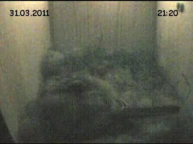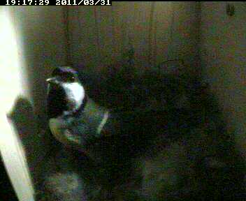 Abends kam Frau Meise dann erstmals zum Übernachten in den Nistkasten. (Leider reicht das Licht nicht mehr für die Farbkamera.)