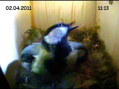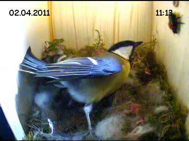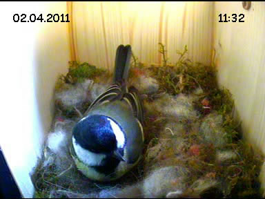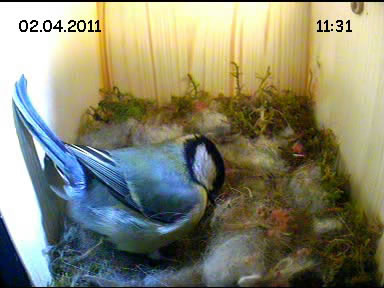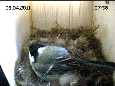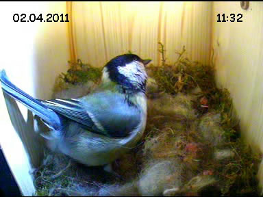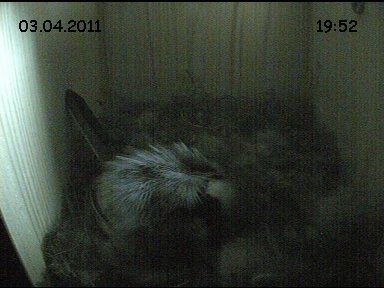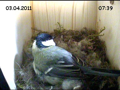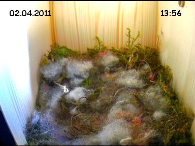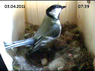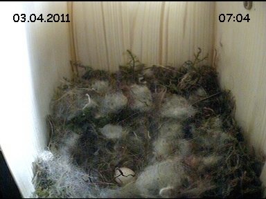 Abends wollte Fr. Meise wieder übernachten, zögerte jedoch und suchte sich schließlich einen anderen Schlafplatz. Anscheinend hat sie jetzt etwas Angst vor dunklen Nistkästen. Sonntag früh kam sie dann um 6:26 erstmals in den Nistkasten. Als sie ihn um 6:53 wieder verließ, lag im Nest das erste Ei: