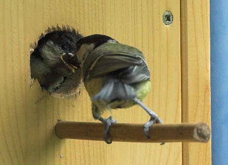 In den letzten Tagen vor dem Ausfliegen lockten die Eltern immer wieder mit Futter am Einflogloch (14. Mai 2011):