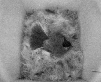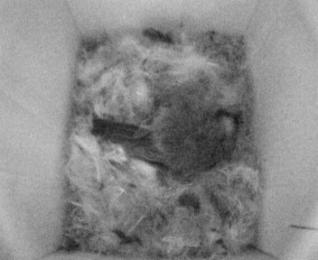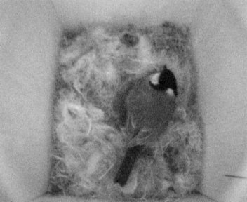 Als ich heute abend die Kamera einschaltete, hatte ich eigentlich einen Nistkasten mit Nest, aber ohne Meise darin erwartet. Denn seit Beginn des Nestbaus vor 9 Tagen (am 29.03.2005) hatte niemand mehr im Nistkasten übernachtet. Heute aber war es anders: