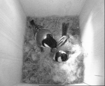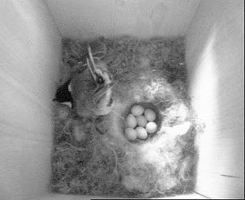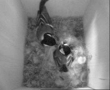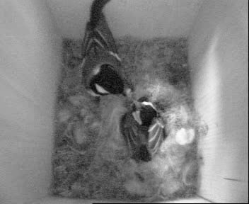 Auch heute abend waren es immer noch sieben Eier, denn als ich das nächste Mal gegen kurz nach 19 Uhr die Kamera einschaltete, war das Weibchen gerade ausgeflogen. Sie kam aber kurz darauf wieder - das Männchen hatte sich wohl ebenfalls schon in seine Unterkunft zurückgezogen, denn es kam an diesem Abend nicht mehr zum Nistkasten. Was soll man bei so einem "Mistwetter" (es hatte heute den ganzen Tag lang geregnet) auch anderes machen als pennen...?