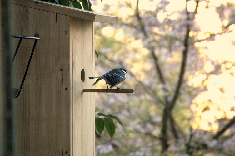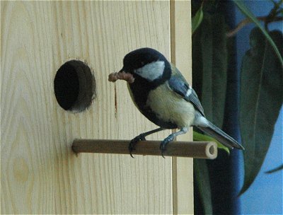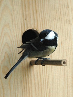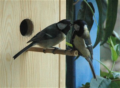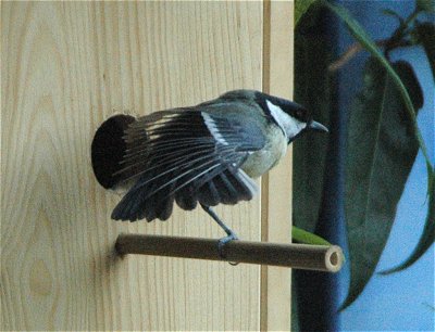Manchmal läßt sich in dem Baum ein Amsel-Weibchen nieder, wohl um eine kleine Rast einzulegen. Damit ist's allerdings spätestens dann vorbei, wenn sie von dem Meisenpärchen entdeckt werden: Mit vereinten Kräften wird solange unter Schimpfen aufgeregt im Baum hin- und hergehüpft, bis die Amselin genervt das Weite sucht (nachdem sie zuerst so getan hatte, als ob sie davon nichts mitbekommt).