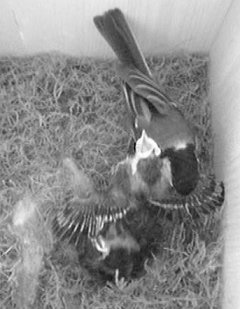 Das andere Küken war dagegen umso lebendiger und "fordernder". Beide hatten an diesem Wochenende ihre Augen geöffnet, und das Überlebende schaute sich jetzt neugierig in seiner neuen Welt um und blickte den Eltern nach, wenn diese den Nistkasten verließen, und fiepste in Richtung Einflugloch gewandt, weil es jetzt wußte, daß von dort die Futterlieferungen kamen.