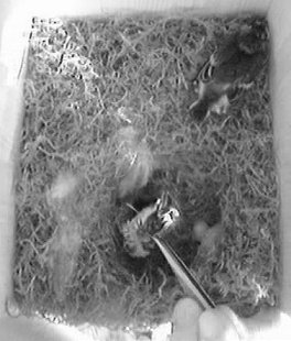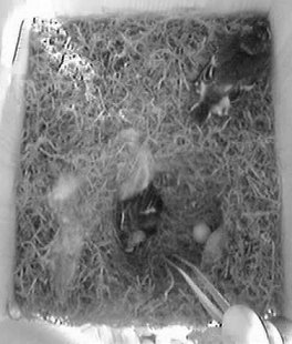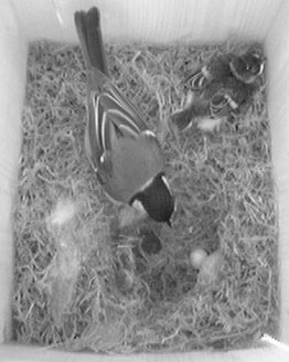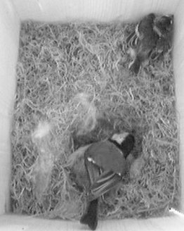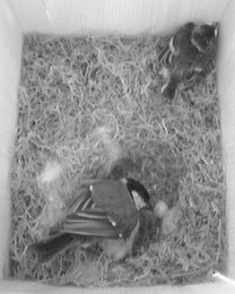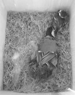 Durch das Herumhantieren am Nistkasten und das Öffnen der hinteren Klappe wurde das noch lebende Küken anscheinend ziemlich eingeschüchtert und saß anschließend minutenlang regungslos in der Ecke. Als später das Weibchen wiederkam, merkte es sofort, daß im Nest etwas anders war. Es wühlte und pickte lange im Nest herum oder saß davor und schien sich nicht ganz schlüssig zu sein, was es tun sollte.