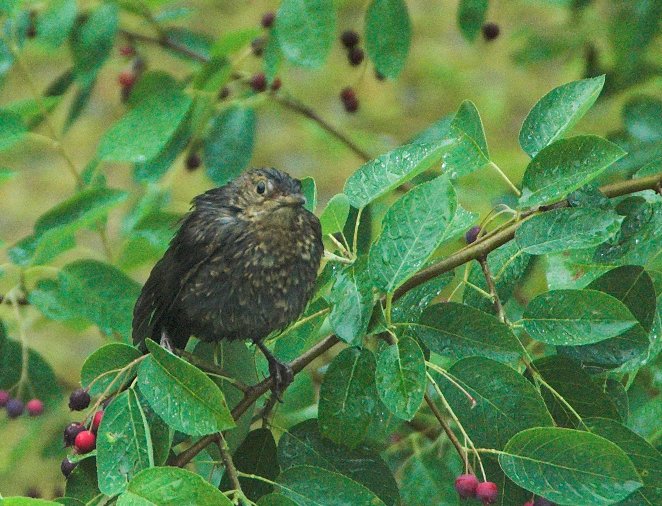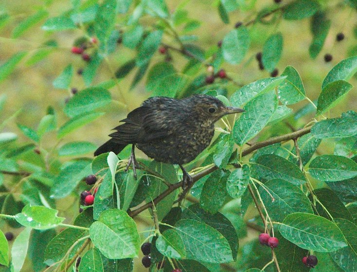 Heute vormittag habe ich durch das geschlossene Küchenfenster hindurch ein paar Aufnahmen von einem Amselweibchen gemacht, das gerade die reifen Beeren von einem vor dem Haus stehenden Strauch gepflückt hat. Das Männchen war währenddessen auf dem Rasen nach Regenwürmern am suchen. (Bei den Bildern handelt es sich um Ausschnittsvergrößerungen.)