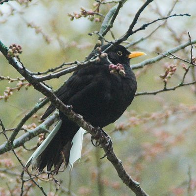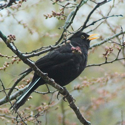 Hier noch zwei Bilder des Amselmännchens, das schon den ganzen Winter über regelmäßig zum Futterplatz kommt und das an seinen zerzausten Schwanzfedern, von denen die äußeren weiß sind, leicht wiederzuerkennen ist. Hier sitzt es gerade auf "seinem" Baum und läßt seinen Reviergesang ertönen: