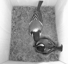 Die Meiseneltern sind scheinbar schon ein eingespieltes Team. Sie arbeiten bei der Fütterung und dem Abtransport der Exkremente perfekt zusammen. Sitzt das Weibchen gerade auf dem Nest, um die Jungen zu wärmen, dann übergibt das Männchen das mitgebrachte Futter (Insekten, Raupen) dem Weibchen, das dann vom Nest aufsteht und es an die Jungen verfüttert.