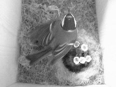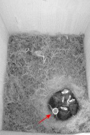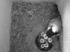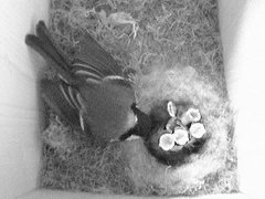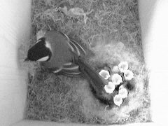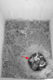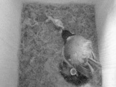 Als ich gestern abend gegen 19:30 die Nistkasten-Kamera einschaltete, sah ich, wie eins der 8 Küken im Nistkasten "auf Wanderschaft" war. Nanu, mit 5 Tagen und noch blind schon so neugierig? Richtig gehen konnte es allerdings noch nicht, es stolperte eher umher und fiel dabei öfters auf den Rücken, wobei es wie ein kleiner Frosch aussah. Anscheinend versuchte es, ins Nest zurückzukrabbeln, konnte es jedoch nicht finden. Zuerst sah es zwar so aus, als würde es darauf zusteuern, lief dann aber doch im Kreis und landete schließlich wieder am Ausgangspunkt an der Nistkastenwand.
