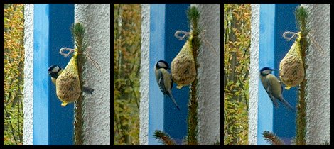 In der Nacht ist es dann doch noch ziemlich stürmisch und laut geworden, aber die Meise hat's nicht gestört. Etwa um 10 nach 7 ist sie - ohne sich zu putzen - plötzlich aufgesprungen und hinausgeflogen. Während sie noch kurz auf der Stange des Nistkastens saß, konnte ich nun erkennen, daß es ein Männchen war. Ob trotzdem im Frühjahr hier gebrütet wird...? - Von der Stange folg sie in den Baum, der ziemlich schwankte, als er von einer Windböe erfaßt wurde, doch die Meise hielt sich fest. Nach der zweiten Windböe verschwand sie nach rechts. Hoffentlich passiert ihr nichts bei diesem Sturm.