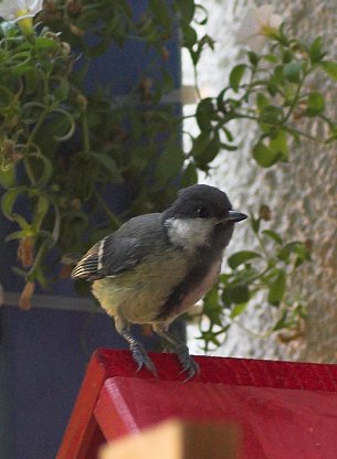 Neugierige Kohlmeise auf dem Dach des Insektenhotels