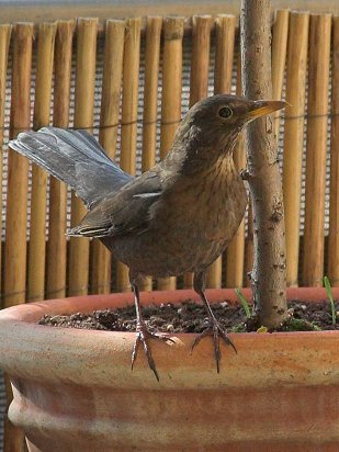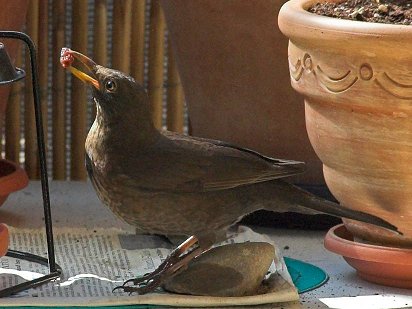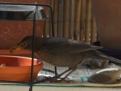Die Amseln kommen immer noch zum Fressen und Trinken her: