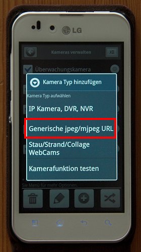 Nach der Installation ruft man im Menü den Punkt "Kameras verwalten" auf und fügt über das "+"-Symbol eine Kamera vom Typ "Generische jpeg/mjpeg URL" hinzu: