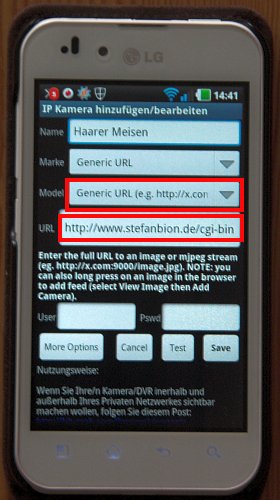 Vor dem Speichern tippt man kurz auf "Test", um sicherzustellen, daß die URL stimmt. Anschließend sollte das Live-Bild zu sehen sein: