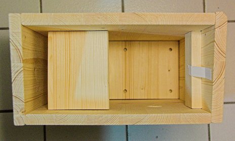 Als Nächstes wurde die Innenausstattung fertiggestellt, d.h. die Führungsschienen für die Glasplatte zwischen Kamera- und Brutraum und für die Sperrholzplatte zur Befestigung der Schwarzweiß-Kamera über dem Brutraum. Die Führungsschienen bestehen aus Fichtenholzleisten mit einem Querschnitt von 13 x 5 mm und wurden an die Innenwände des Nistkastens geleimt. Hier die dazugehörigen Skizzen: