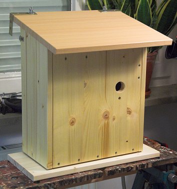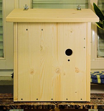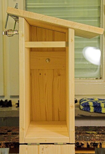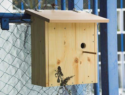 Das Dach ist lediglich mit zwei Scharnieren an der Rückwand befestigt und vorne nicht arretiert; durch das Eigengewicht des Nistkastens bleibt es von selbst geschlossen, während der Nistkasten am Balkongeländer hängt.