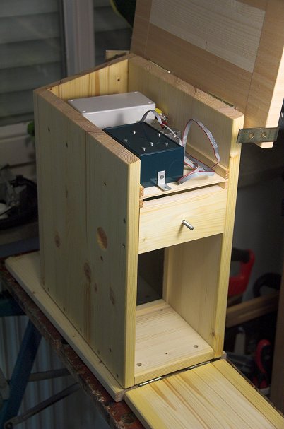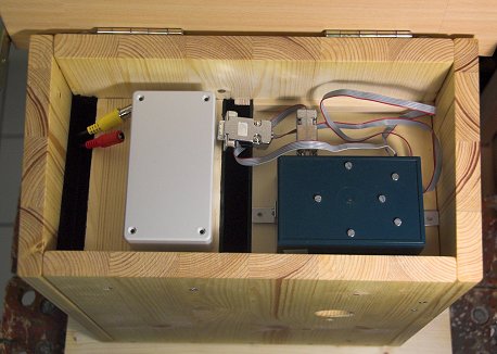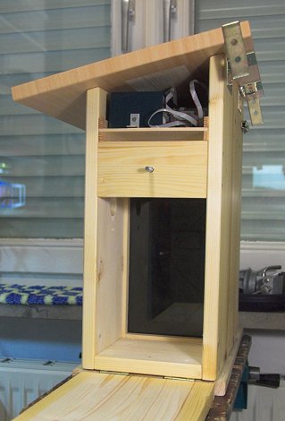 In der Mitte des Nistkastens befindet sich eine Glasplatte zur räumlichen Abtrennung der Farbkamera vom Brutraum. Zwischen beiden Kameras kann manuell oder automatisch hin- und hergeschaltet werden. Hier beschreibe ich Aufbau und Technik des 3. Nistkastens.