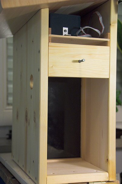Zur Durchführung der Kabel nach außen wurde eine Kerbe in die Rückwand gemacht. Der drehbar angebrachte Alustreifen soll die Kabel beim Öffnen des Nistkastens in ihrer Position halten: