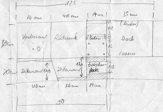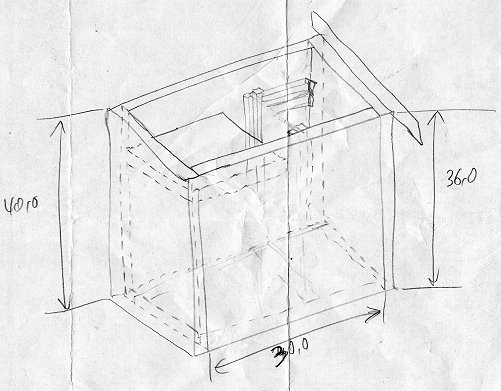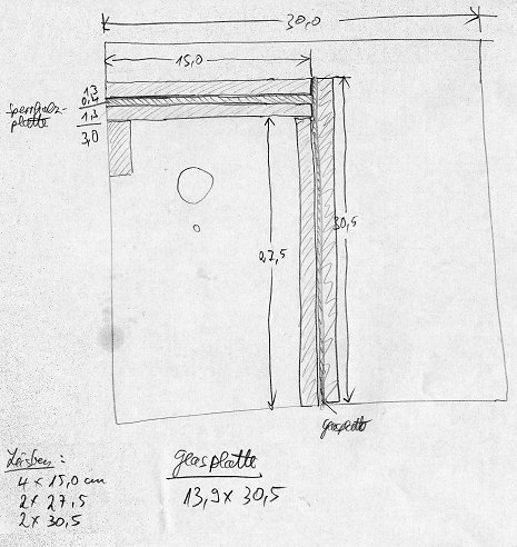 In die Mitte des Innenraums kommt eine Glasscheibe als Trennwand zwischen Brut- und Kameraraum. In den linken Teil kommt dann die Farbkamera, die das Geschehen von seitlich oben erfassen soll. Oben drüber wie bisher die S/W-Kamera mit Mikrofon. Die Farbkamera wird beweglich (mittels Magnet) an der linken Seitenwand befestigt. Bei dem neuen Nistkasten sind beide Seitenwände nach unten und das Dach nach oben aufklappbar. Das ist erforderlich, um überall gut heranzukommen. Hier der "Plan", wie ich mir das vorgestellt habe: