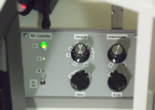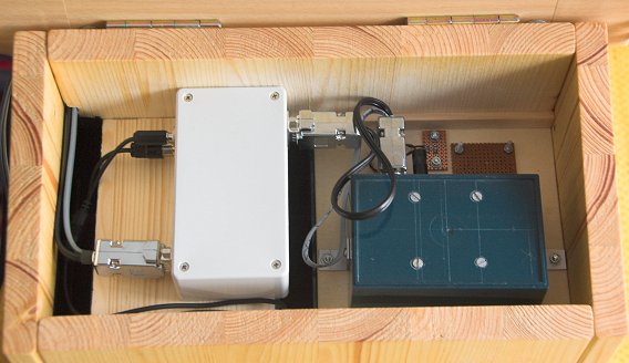 Das Steuergerät ist über eine 15 Meter lange Leitung mit dem Nistkasten verbunden. Über das Steuergerät erfolgt die Stromversorgung sowie die Steuerung der beiden Nistkasten-Kameras und der Infrarotbeleuchtung.