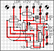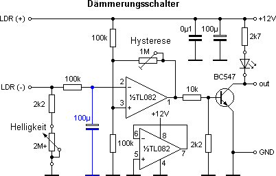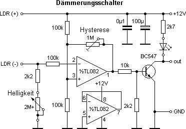 Der im Steuergerät untergebrachte Dämmerungsschalter besteht aus einem Komperator mit einstellbarer Hysterese. Mit dem logarithmischen 2M-Poti wird die Empfindlichkeit so eingestellt, daß die IR-Beleuchtung erst dann eingeschaltet wird, wenn es für die Kameras zu dunkel geworden ist. Da der LDR auch auf IR-Licht anspricht, muß die Hysterese mit dem 1M-Trimmpoti gerade so groß eingestellt werden, daß die IR-Beleuchtung nicht gleich wieder ausgeschaltet wird. Unnötig groß sollte die Hysterese dagegen nicht sein, damit die IR-Beleuchtung nicht zu spät wieder ausgeschaltet wird, wenn es wieder heller wird.