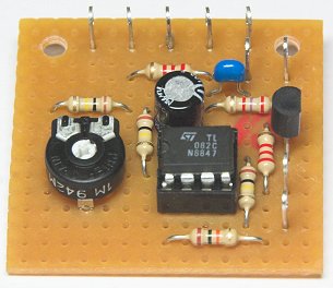 Die Eingänge des zweiten, unbenutzten OpAmp des TL082 wurde so beschaltet, daß er nicht unkontrolliert zu schwingen anfangen kann, was Störungen verursachen und den Stromverbrauch erhöhen könnte.