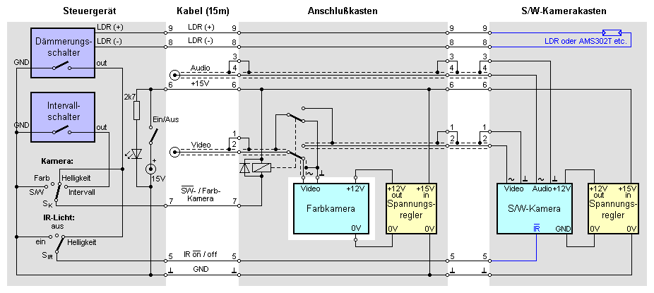 Die helligkeitsgesteuerte Kamera-Auswahl bzw. Aktivierung der Infrarotbeleuchtung erfolgt über einen Dämmerungsschalter mit Fotowiderstand (LDR). Für die intervallgesteuerte Kamerawahl wird ein Intervallschalter verwendet.