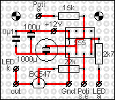 Als Poti habe ich einen logarithmischen Typ gewählt, damit die Einstellung im unteren Bereich feiner ist als im oberen, d.h. die Intervalle zwischen z.B. 10 und 60 Sekunden lassen sich genauer einstellen als die Intervalle zwischen 120 und 180 Sekunden.