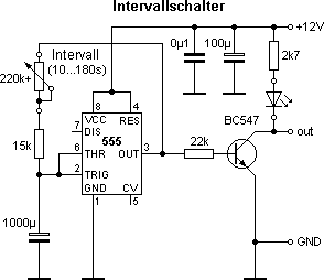 Der ebenfalls im Steuergerät untergebrachte Intervallschalter ist mit einem Timer-Baustein 555 aufgebaut. Dieser ist so beschaltet, daß Ein- und Ausschaltzeit in etwa gleich sind. Die Funktionsweise der Schaltung ist folgende: Ist der Ausgang (Pin 3) auf 12V, wird der 1000µ-Elko über das 220k-Poti und den 15k-Widerstand solange aufgeladen, bis die Spannung an TRIG (Pin 2) den Schwellwert von ca. 8V erreicht. Dadurch schaltet der Ausgang (Pin 3) auf 0V, wodurch der Elko über das Poti und den Widerstand solange entladen wird, bis die Spannung an THR (Pin 6) auf etwa 4V gefallen ist. Dadurch schaltet der Ausgang (Pin 3) wieder auf 12V, und das Spiel beginnt von Neuem. Ein- und Ausschaltzeit hängen somit direkt von den Werten des Elkos und der Reihenschaltung aus Widerstand und Poti ab. Diese wurden durch Ausprobieren so dimensioniert, daß sich eine Ein- und Ausschaltzeit von jeweils ca. 10...180 Sekunden ergibt.