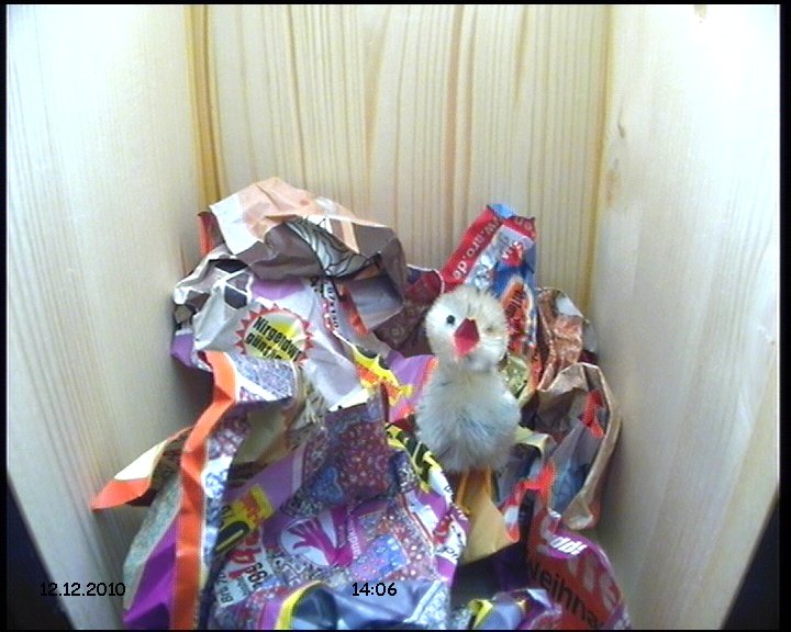 Im Winter 2010 wurde der bisherige Nistkasten durch einen neuen 3. Nistkasten ersetzt. Hier einige erste Testbilder mit der Farbkamera bei Tageslicht.