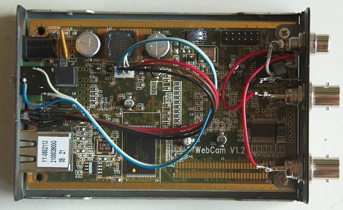 Um das Signal der "Heartbeat-LED" abgreifen zu können, war eine kleine Modifikation am Videoserver erforderlich. An den LED-Stecker wurde ein zusätzliches Kabel (hier blau/weiß) angelötet und über eine zusätzlich angebrachte Klinkenbuchse (3,5 mm stereo) nach außen geführt: