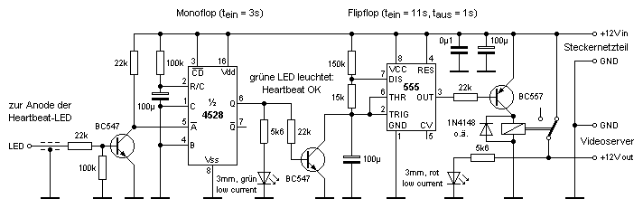 Das Funktionsprinzip: Ein flankengesteuertes, nachtriggerbares Monoflop mit einer Einschaltzeit von 3 Sekunden wird regelmäßig von der "Heartbeat-LED" (nach-)getriggert. Der Ausgang des Monoflops steuert einen Transistor an, dessen Collector-Emitter-Strecke parallel zum zeitbestimmenden Kondensator (100µF-Elko) eines Flipflops liegt. Während eines H-Pegels am Ausgang des Monoflops ist der Transistor durchgeschaltet und entlädt dadurch den Elko des Flipflops. Solange die "Heartbeat-LED" blinkt, hat der Elko also nie die Chance, sich aufzuladen, um den Ausgang des Flipflops von H auf L zu schalten. Erst wenn der "Heartbeat" länger als 3 Sekunden ausbleibt, sperrt der Transistor, und der Elko wird allmählich aufgeladen. Erreicht die Ladespannung des Elkos nach ca. 19 weiteren Sekunden 2/3 der Betriebsspannung, schaltet der Ausgang des Flipflops für 1 Sekunde auf L. Dadurch wird ein Relais geschaltet, dessen Öffner die Stromversorgung des Videoservers für ebenfalls 1 Sekunde unterbricht. Danach geht die LED des Videoservers zuerst aus (falls sie nicht eh schon aus ist), beginnt dann zu flackern und schließlich wieder regelmäßig zu blinken. Die Zeit bis zum erneuten Blinken der "Heartbeat-LED" darf allerdings die Einschaltzeit des Flipflops von 11 Sekunden nicht überschreiten, da andernfalls das Flipflop erneut kippt und der Server erneut neu gestartet wird. Normalerweise reicht diese Zeit jedoch mehr als aus.