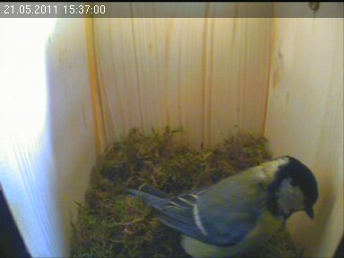 Später, als mir kurz vor dem Flüggewerden der Meisenkinder im Mai 2011 der VIVOTEK VS3100P abgeraucht war, habe ich das Netbook noch einmal eingesetzt - diesmal allerdings mit der 60-Tage-Testversion von WebcmaXP. Hierbei hatte ich die Software ebenfalls so konfiguriert, daß bei Bewegungserkennung ein Schnappschuß auf den Webserver hochgeladen wurde, wo die Bilder in einer Galerie dargestellt wurden. Für das Live-Bild wurde das Kamerabild per HTTP direkt vom Videoserver geholt und auf der Webseite angezeigt, was schnellere Bildwiederholraten ermöglicht (ca. alle 2 Sekunden 1 Bild).