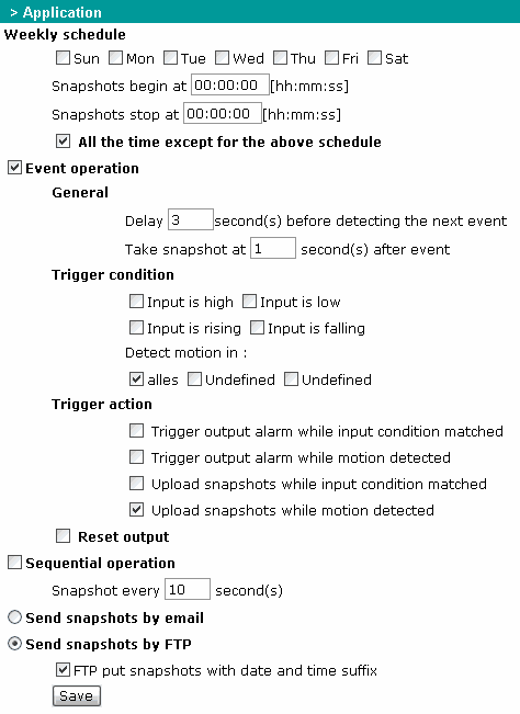 Erst einmal sollte hier durch Setzen des Häkchens vor "All the time..." angegeben werden, daß es keine zeitliche Einschränkung geben soll. Nun kann man wählen, ob man a) einen ereignisgesteuerten (also z.B. durch Bewegungserkennung ausgelösten) Upload des aktuellen Kamerabildes durchführen möchte, oder b) einen regelmäßigen Upload alle x Sekunden. Im Fall a) hakt man "Event operation" und unter "Trigger condition" bei "Detect motion in:" das zuvor angelegte Fenster für die Bewegungserkennung an (in meinem Fall "alles") an. Im Fall b) hakt man "Sequential operation" an und gibt unter "Snapshot every" ein, alle wieviel Sekunden (z.B. 10) das aktuelle Kamerabild per FTP hochgeladen werden soll. Schließlich wählt man noch "Send snapshots by FTP" aus. Wenn man das Kamerabild unter einem unveränderlichen Namen in die Webseite einbinden möchte, sollte man auf jeden Fall das Häkchen bei "FTP put snapshots with date and time suffix" entfernen. Ohne dieses Häkchen ist das Bild unter dem immer gleichen Namen "video.jpg" erreichbar, mit Häkchen wird der Dateiname durch den aktuellen Zeitstempel erweitert (z.B. "videotrg20110304065840.jpg"), was sich nicht verlinken ließe.