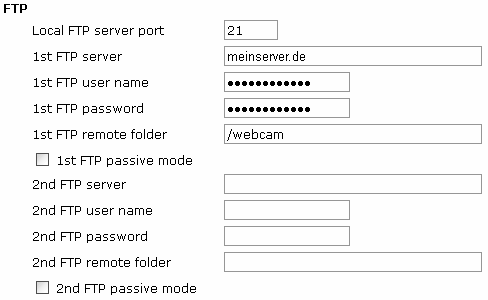 Wenn es sich um den Webserver handelt, auf dem auch die Homepage liegt, dann empfehle ich, dort aus Sicherheitsgründen einen neuen FTP-Zugang anzulegen, der ausschließlich für das Hochladen der Kamerabilder verwendet wird und der nur in ein Unterverzeichnis auf dem Server schreiben darf, z.B. "/autoupload". Da bei FTP-Anmeldungen Benutzername und Paßwort unverschlüsselt "im Klartext" durch das Internet gesendet werden, könnte ansonsten ein böser Hacker den Benutzernamen und das Paßwort mitlesen und so z.B. den Server hacken. So kann er sich nur an den Kamerabildern vergreifen.