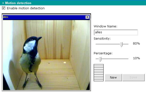 Wenn die Kamerabilder nur bei Erkennung einer Bewegung im Bild hochgeladen werden sollen, dann muß nun die Bewegungserkennung konfiguriert werden. Hierzu geht man ins Menü "Motion detection", aktiviert das obere Häkchen, legt ein Fenster an, zieht es auf die richtige Größe, gibt ihm einen Namen (hier: "alles", weil ich das Fenster maximal groß gemacht habe) und stellt die Schieberegler durch Ausprobieren so ein, daß Bewegungen von Meisenvögeln zwar noch zuverlässig erkannt werden, aber nicht gleich jede Fliege eine Bilderflut auslöst: