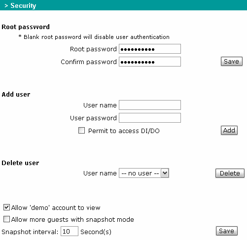 Unter "Security" sollte man zunächst ein Root-Paßwort vergeben, da ansonsten jeder von außen an der Konfiguration des Videoservers herumspielen könnte. Wenn Besucher von außen auf den Videostream oder das Kamerabild zugreifen können sollen, kann man zusätzliche Benutzer einrichten oder durch Setzen des entsprechenden Häkchens dem Benutzer "demo" (ohne Paßwort) lesenden Zugriff erlauben.