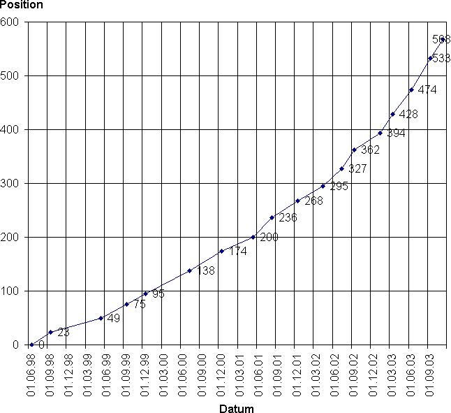 Da lange Zahlenkolonnen ziemlich nichtssagend sind, erstellte ich daraus mit Hilfe des Diagramm-Assistenten von Excel eine schöne Kurve: