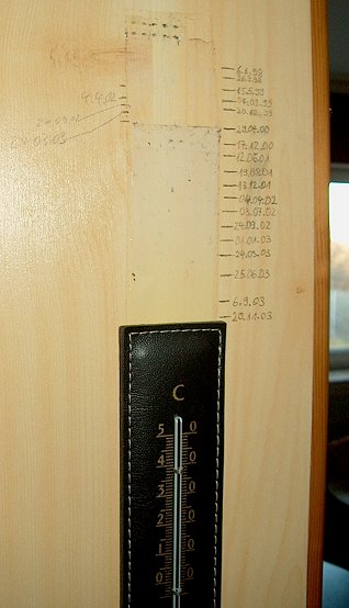 Ich machte mir einen Spaà daraus, alle paar Monate, wenn ich zufÀllig mal dort vorbeikam und daran dachte, an der oberen Kante des Thermometers eine Bleistiftmarkierung anzubringen und mit dem aktuellen Datum zu versehen. So ging das mehrere Jahre bis zu meinem Auszug aus dieser Wohnung. Kurz bevor die Möbelpacker kamen, schoà ich noch schnell ein Foto von der Schrankseite mit dem Thermometer und den Markierungen.