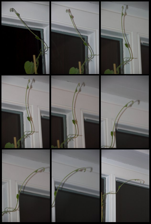Nicht schlecht gestaunt habe ich, als ich mal nachts in die Küche kam, wo 5 der 8 Töpfe mit je 3 Winden stehen, und bemerkte, dass sich die Triebe, die über die 90 cm langen Bambusstangen hinausgewachsen waren, auf der Suche nach Halt bewegten! Ich dachte zuerst, ich hätte mich getäuscht - ich kannte das bisher nur von Mimosen und Venusfliegenfallen, dass sich Pflanzen in einer Geschwindigkeit bewegen, die für das menschliche Auge direkt wahrnehmbar ist. Aber ganz normale Winden?